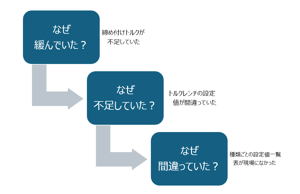 例えば、「ボルトが緩んでいた(Machineの不備)」という事実があったとします。